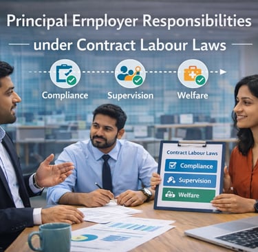 Principal employer responsibilities under contract labour laws cannot be outsourced or diluted. HR plays a central role in ensuring registrations, contractor oversight, wage protection, welfare facilities, and legal boundaries are maintained consistently.